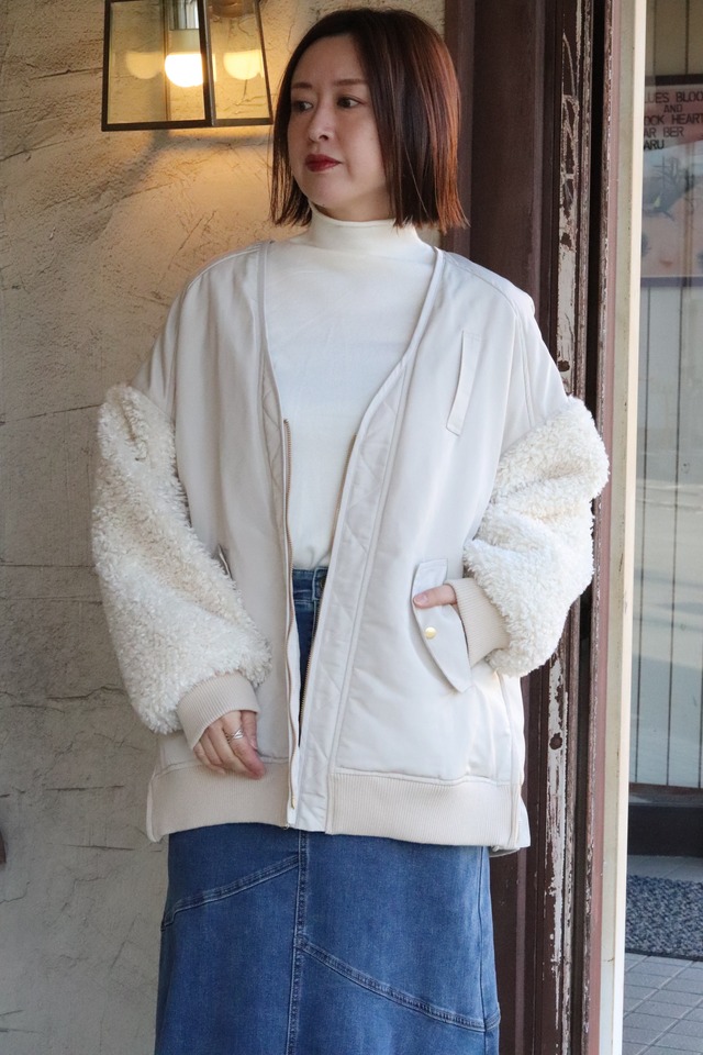 • trois カーリーボア×ポリツイル Vネックブルゾン(T256-84042)