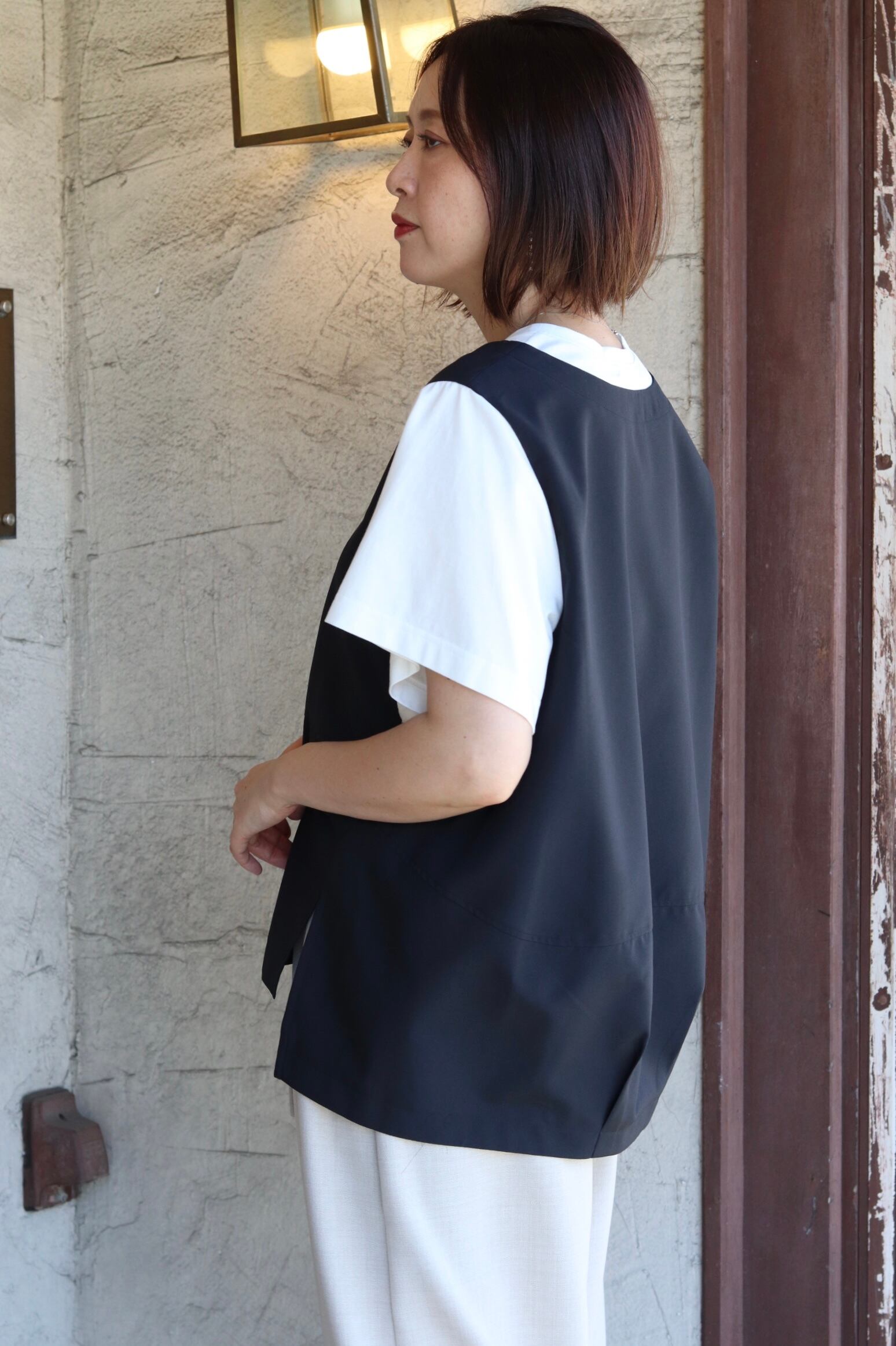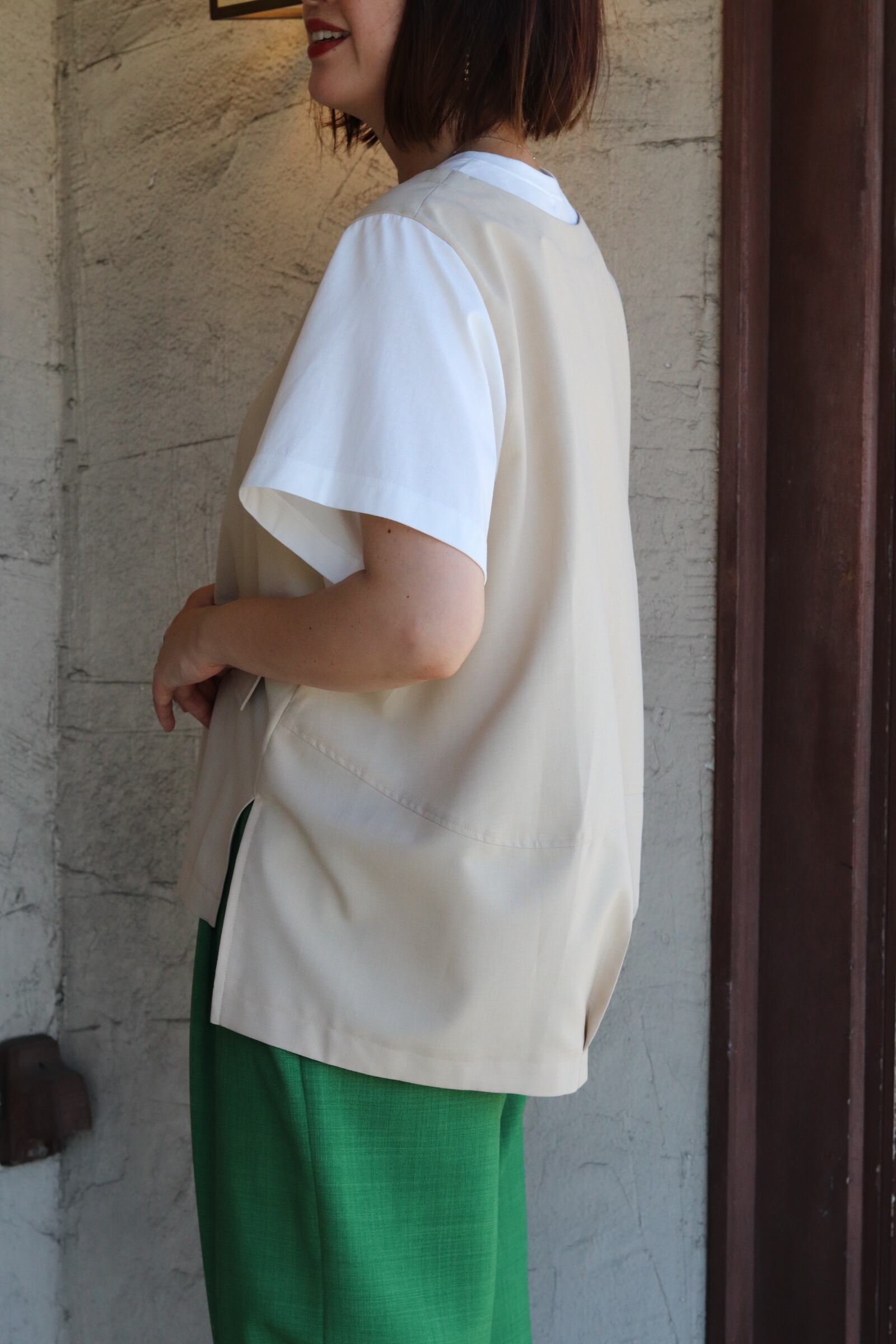 上質なコットン100%の肌当たりの良い滑らか素材にUネックのベストをレイヤードしたデザインプルオーバー。同素材のパンツとのセットアップがぐっとお洒落な印象に。上品なシルエットが大人キレイコーデに。