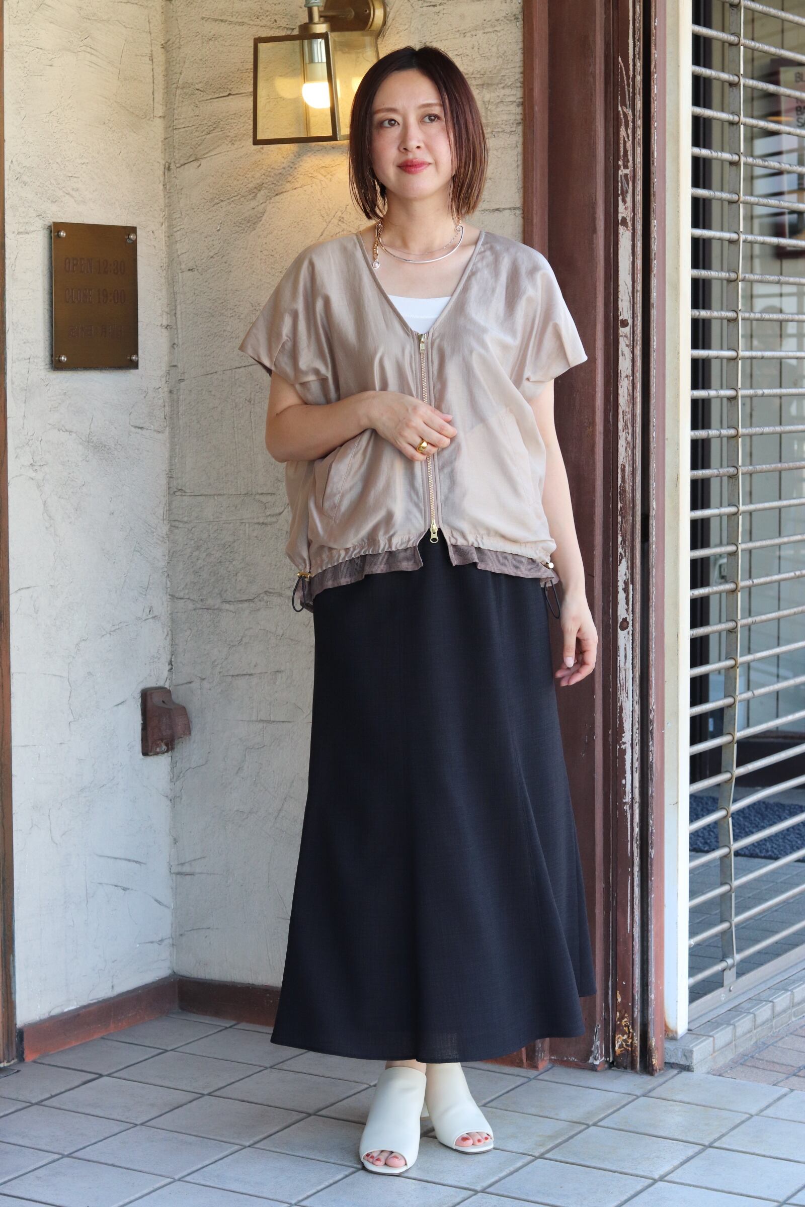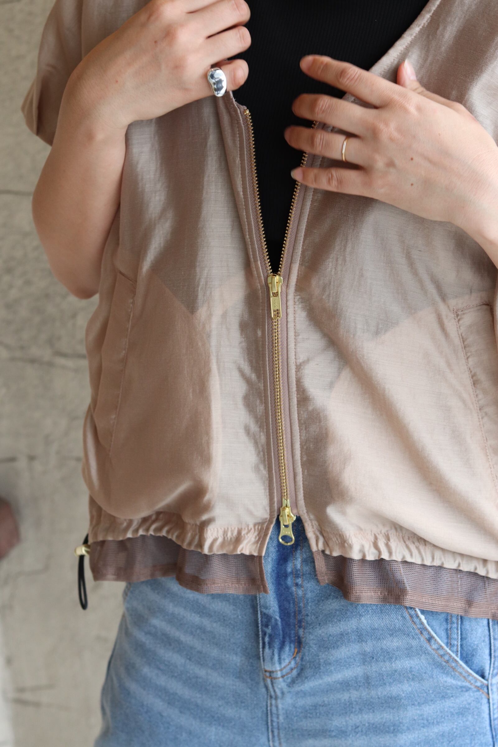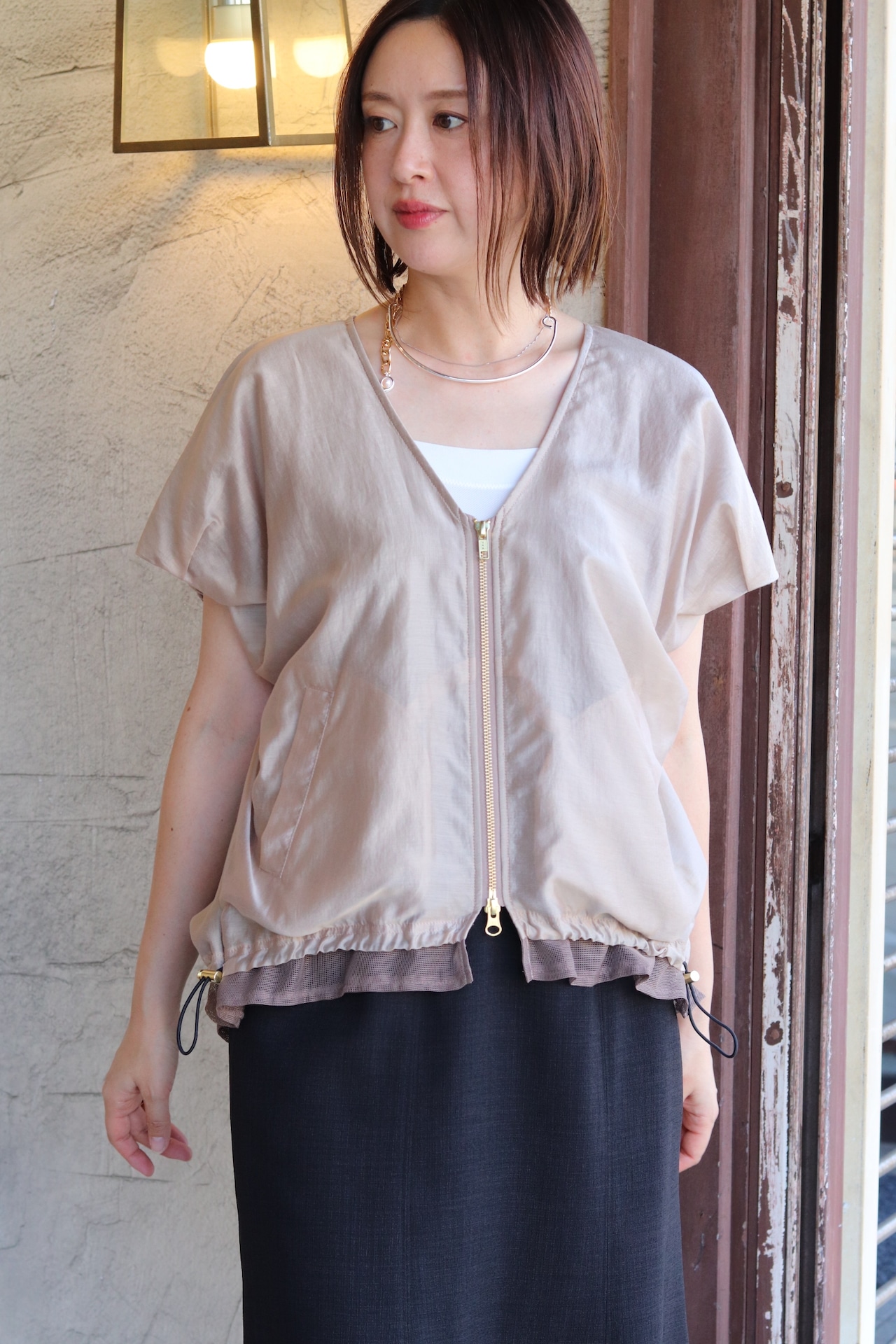 メッシュとサテンを組み合わせた涼し気な雰囲気のブルゾンです。後ろのシャーリングがポイント。透け感のある素材感がさっと羽織るだけでお洒落に決まります。