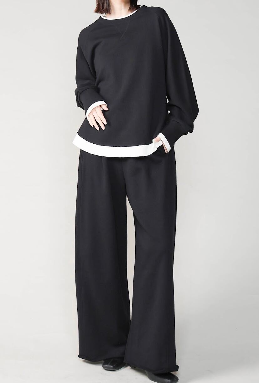 首元や裾からインナーを重ねたように見えるデザインで一枚で着るだけで自然なレイヤードスタイルが完成!さりげない切りっぱなしデザインもアクセントに。シンプルでゆったりとしたシルエットで、デイリーウェアとしても長く活躍します。同素材のパンツと合わせればセットアップスタイルに◎