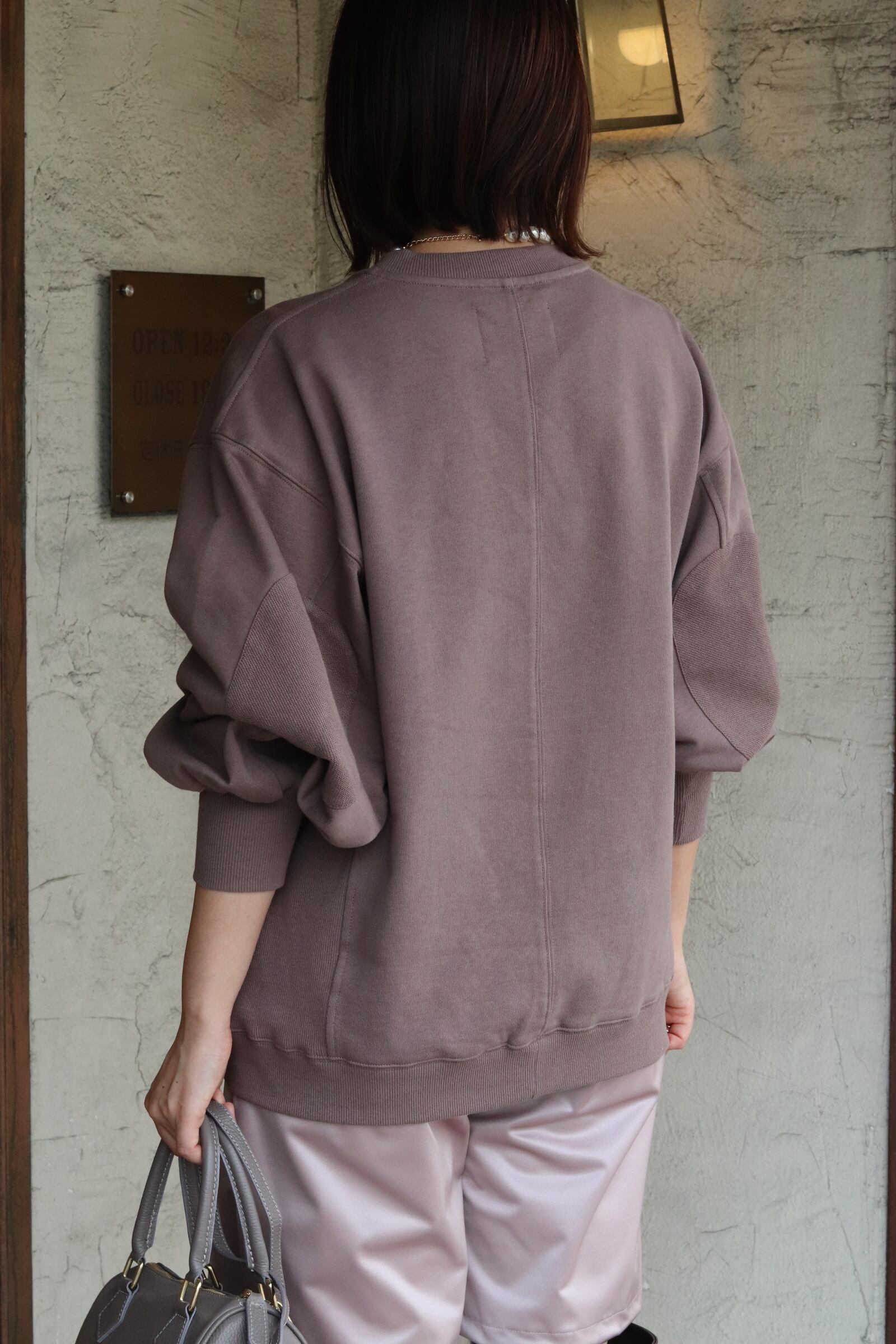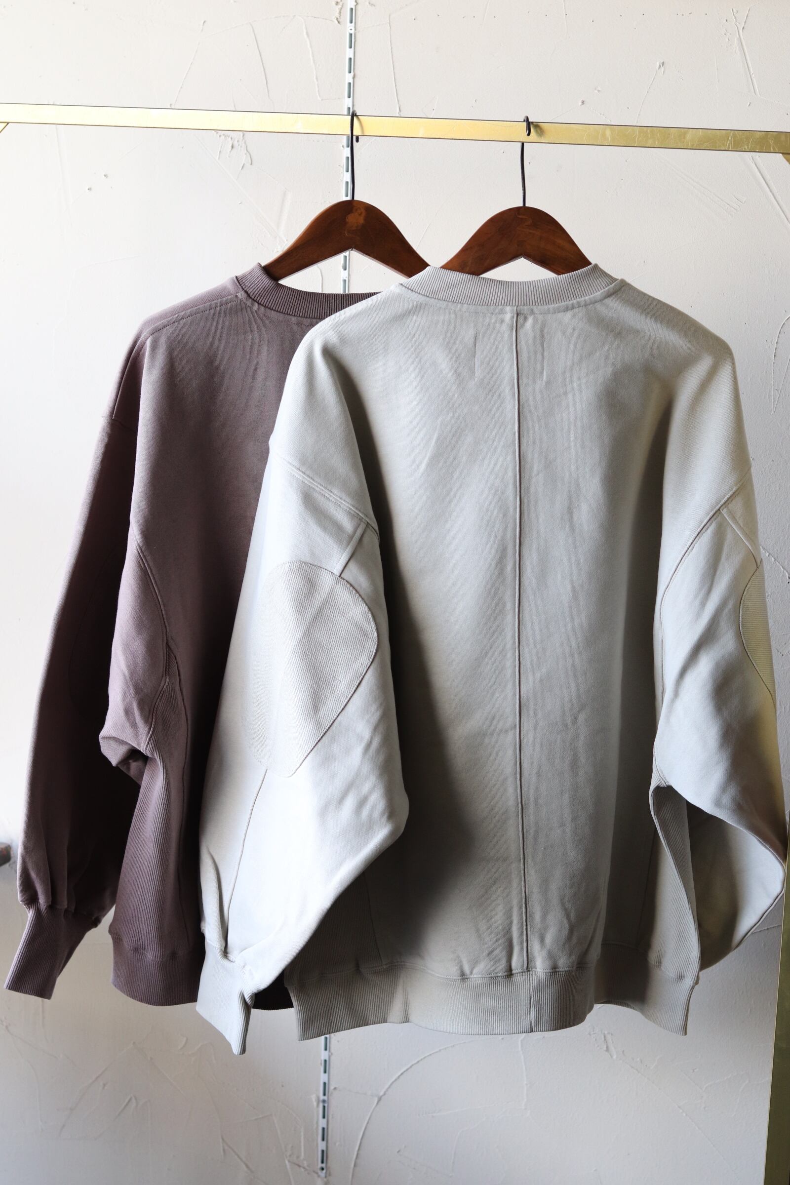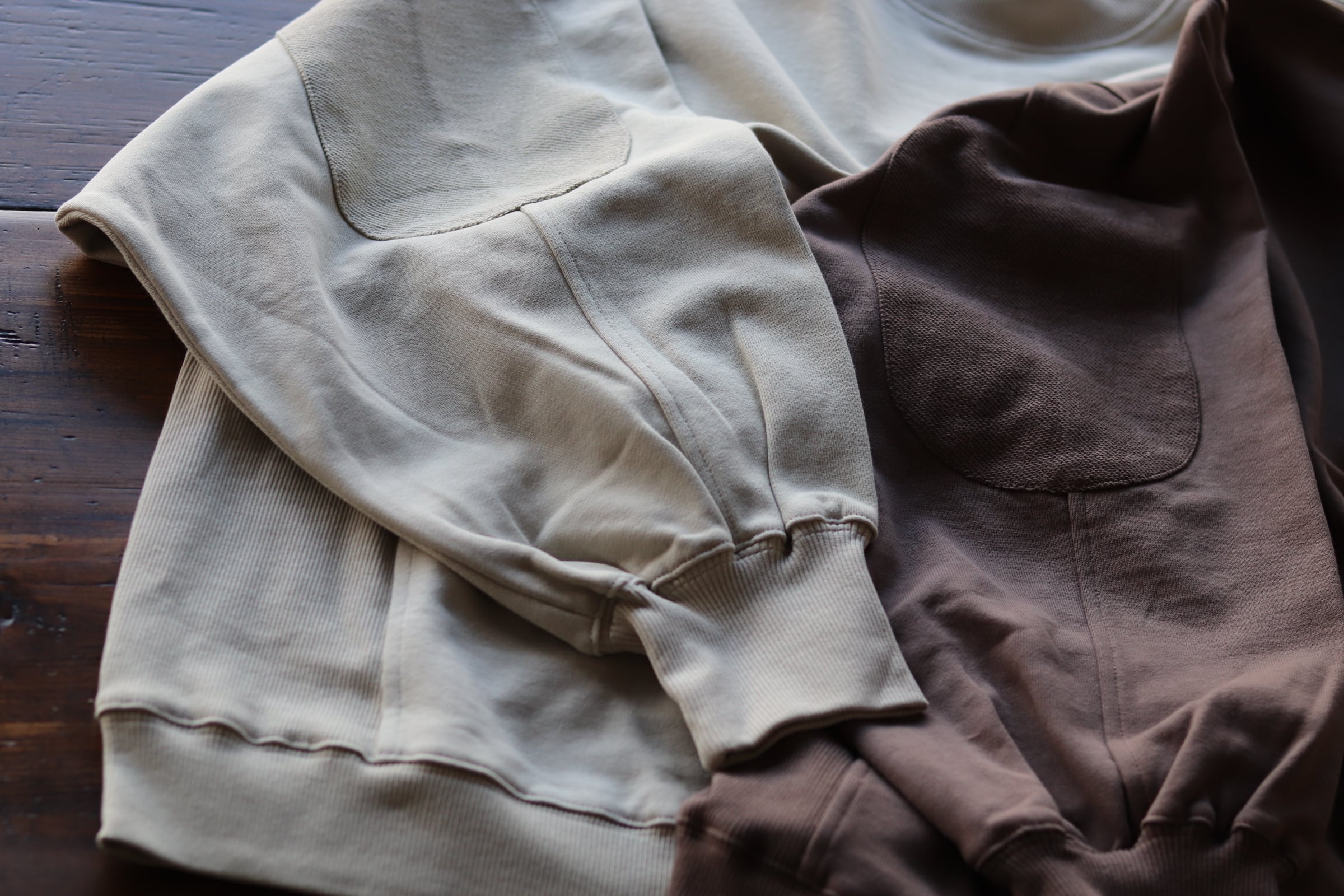 密度高く編まれた綿100%のスウェット素材を使用。洗いをかけたような風合い、色出しが特徴的な生地で高密度な編みにより中肉でありながらヘビーオンスの風合いを実現しています。70年代チャンピオンのビッグスウェットをベースにアームホール、袖を変形させたオーバースウェット。素材の風合いを活かしながらもシルエットやディティールに今らしさを落とし込み、エルボーパッチをつけることで当時の感じを出したアイテムです。パンツスタイル~スカートスタイルまで幅広く対応できる一着です。