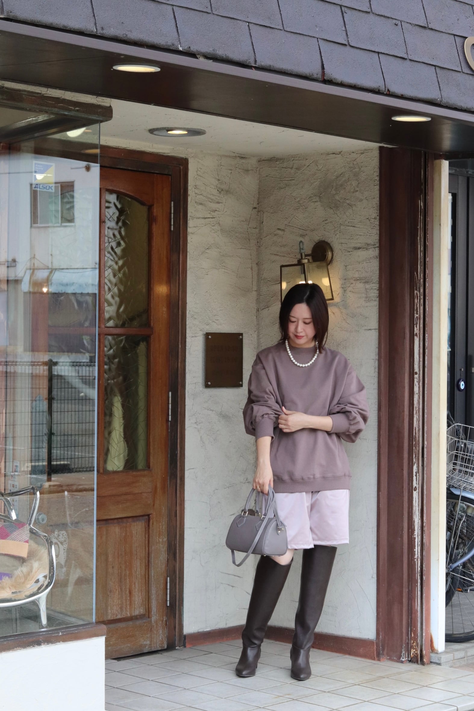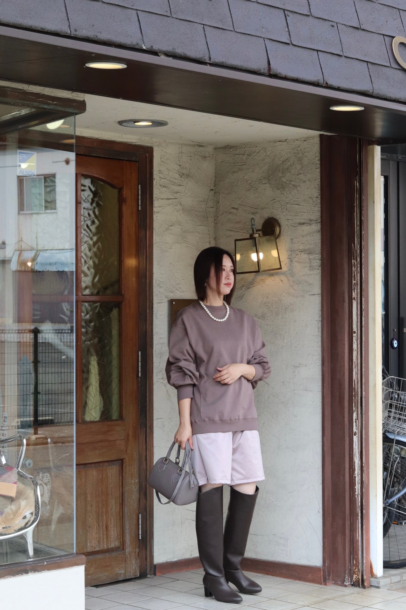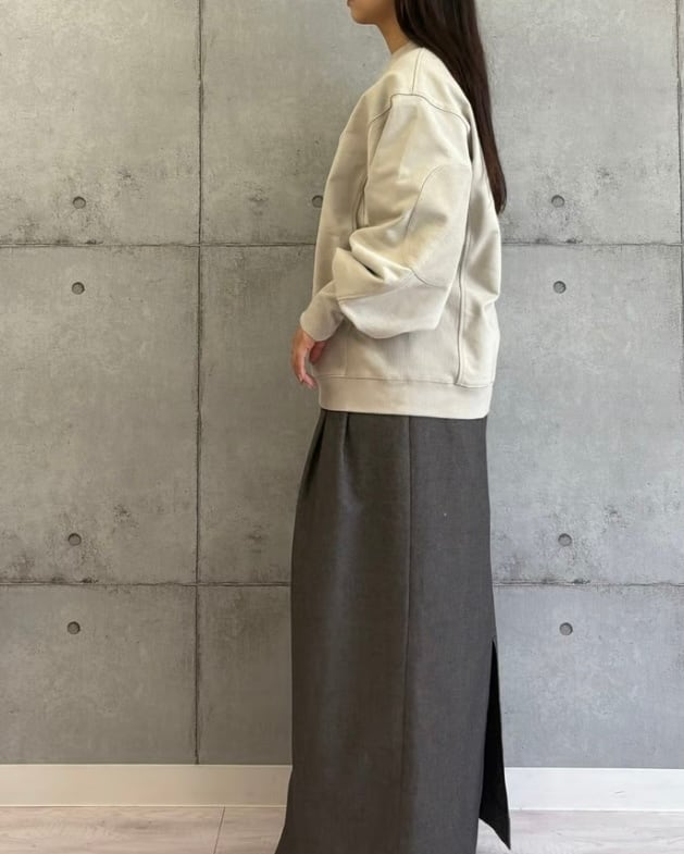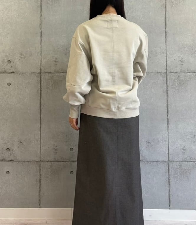 密度高く編まれた綿100%のスウェット素材を使用。洗いをかけたような風合い、色出しが特徴的な生地で高密度な編みにより中肉でありながらヘビーオンスの風合いを実現しています。70年代チャンピオンのビッグスウェットをベースにアームホール、袖を変形させたオーバースウェット。素材の風合いを活かしながらもシルエットやディティールに今らしさを落とし込み、エルボーパッチをつけることで当時の感じを出したアイテムです。パンツスタイル~スカートスタイルまで幅広く対応できる一着です。