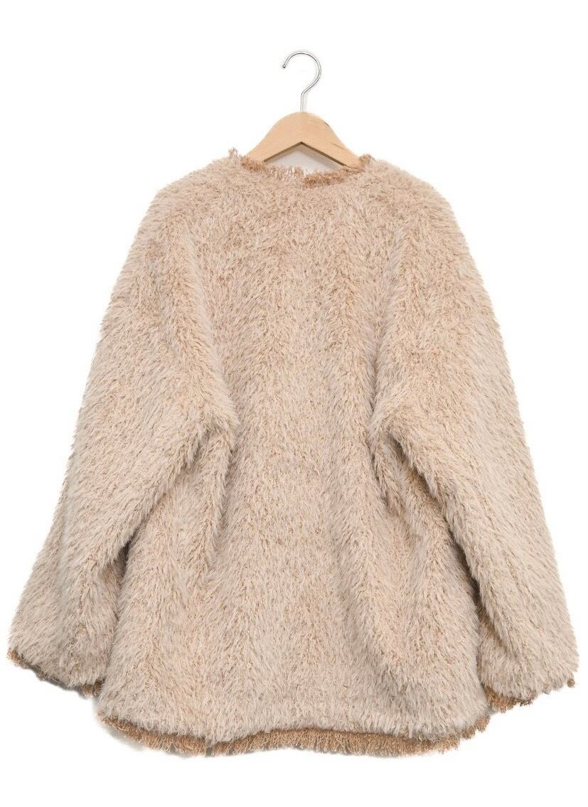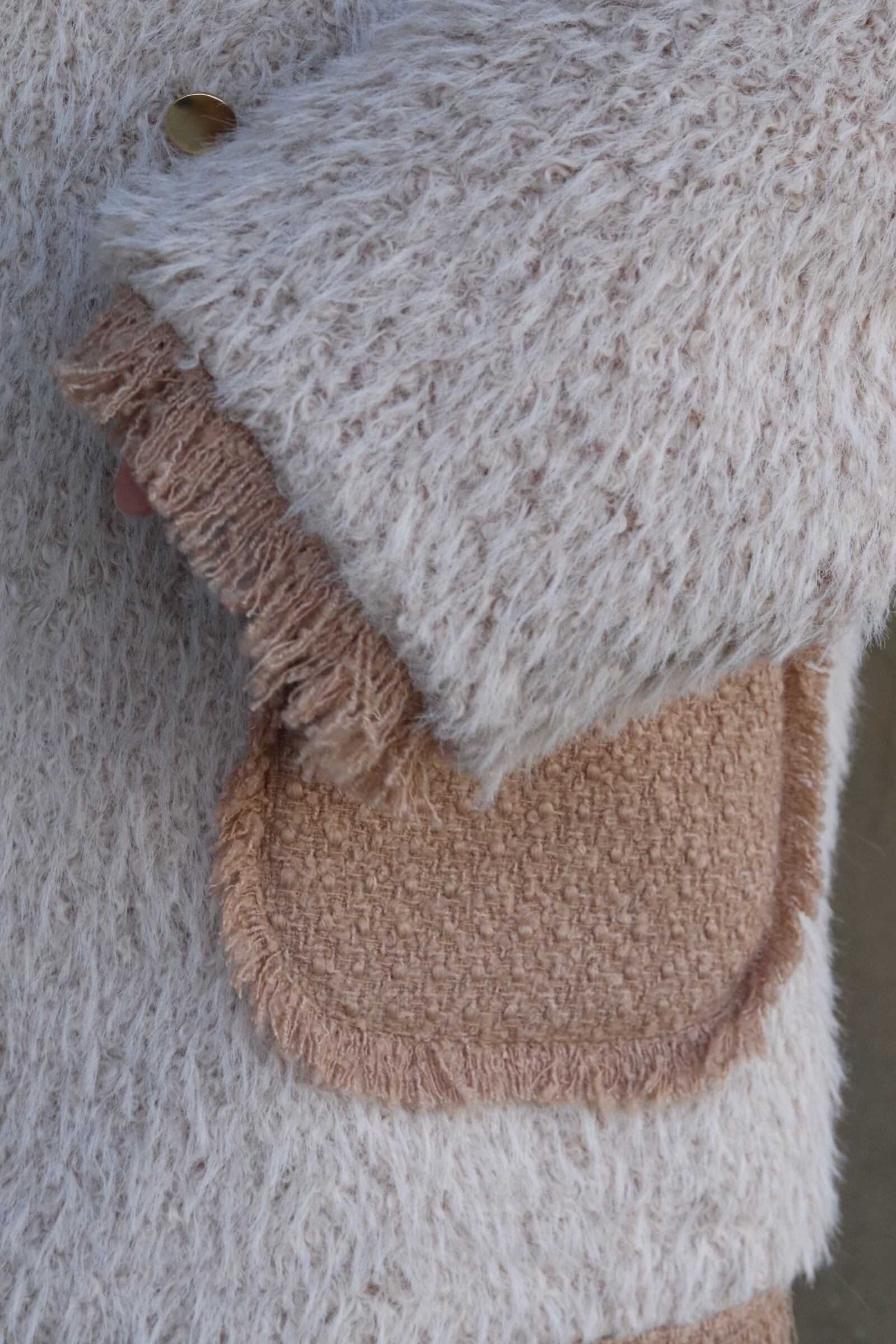 ふんわりと柔らかなフェイクファーに、クラシカルな雰囲気のツイードポケットを組み合わせたハーフ丈ジャケット。