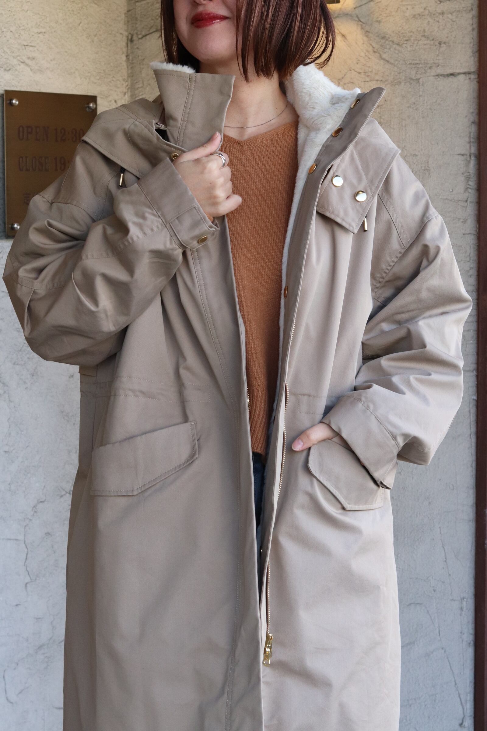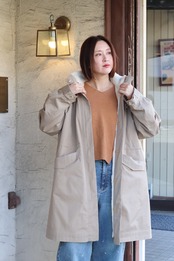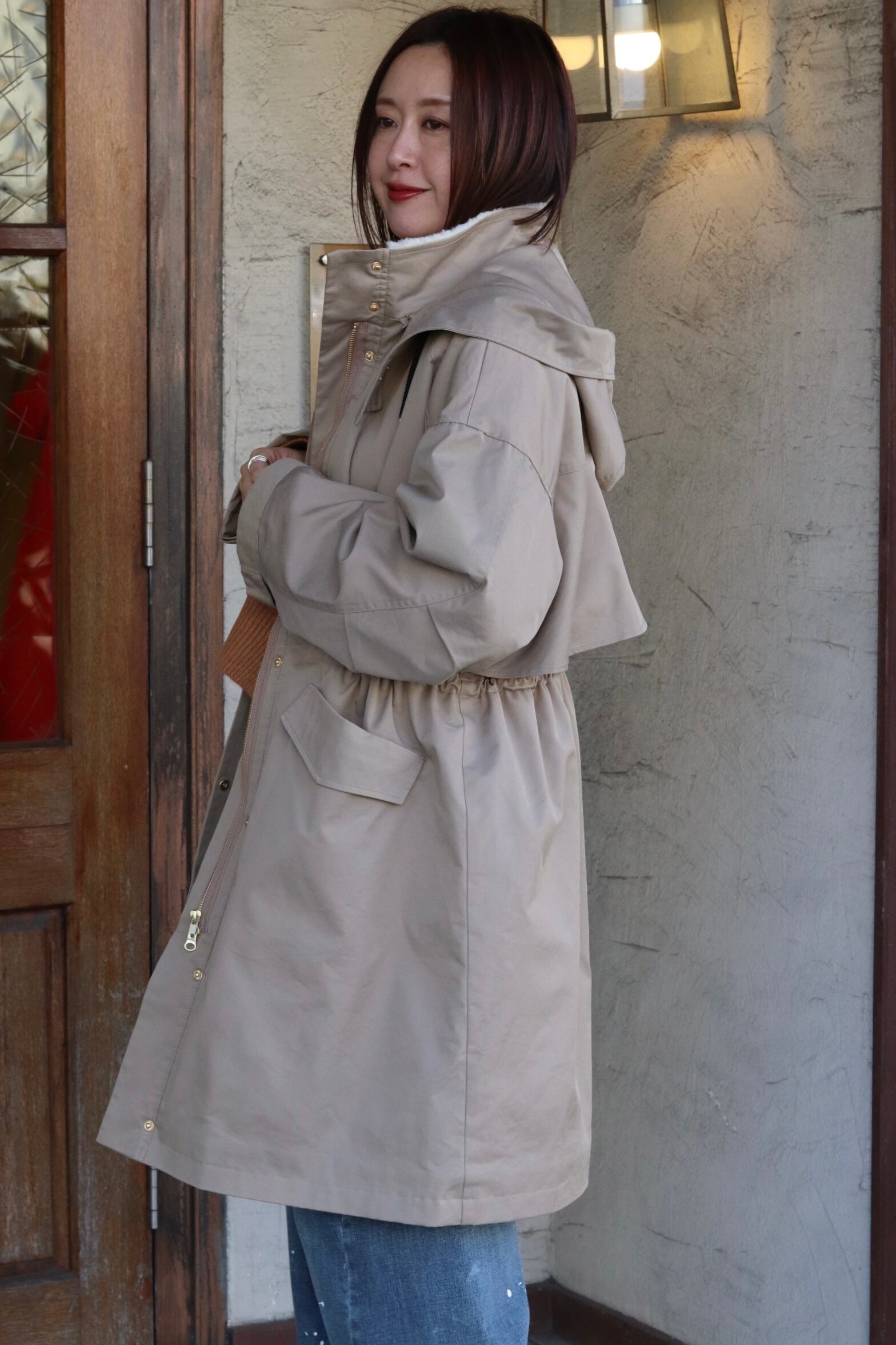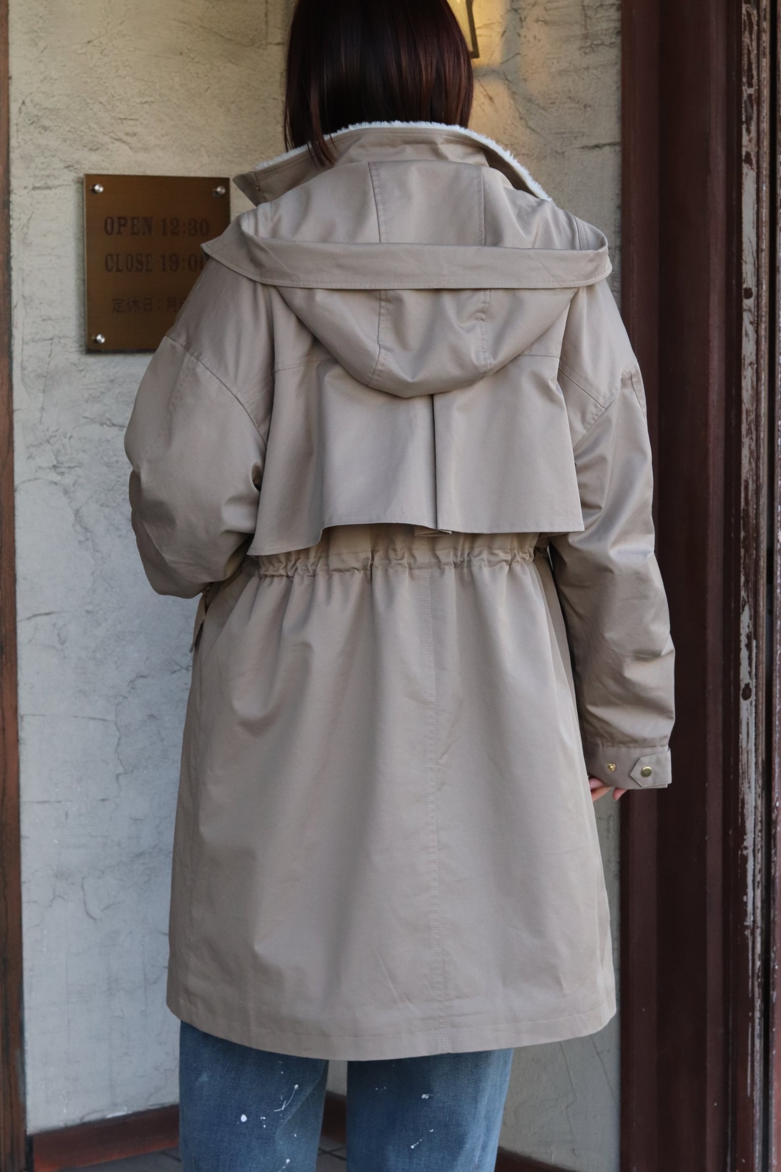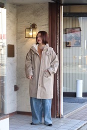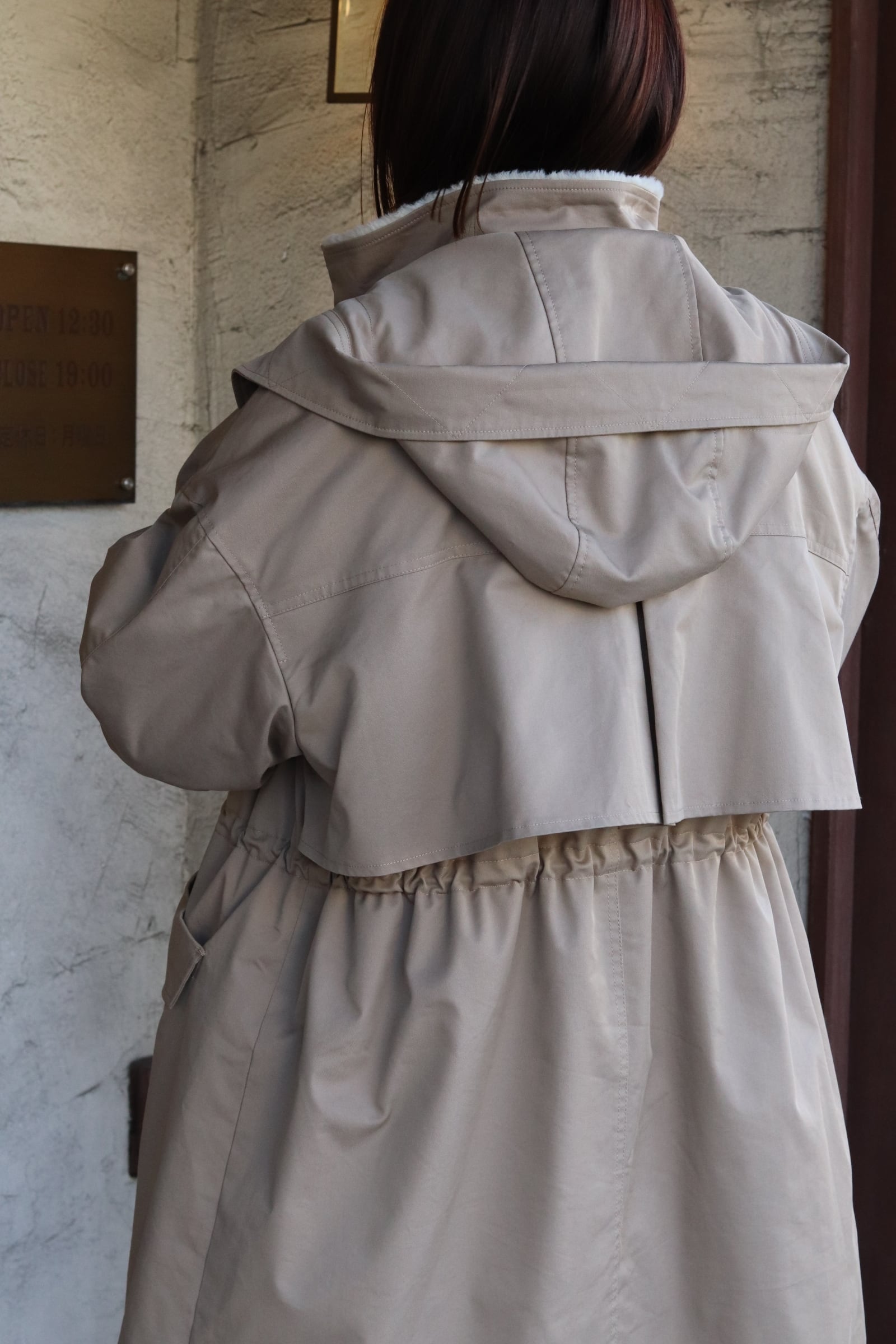 フード取り外し可能で、ウエストはドロスト調整ができるのでシルエットの印象を変えられます。背ヨークやベント風の切替で、動きやすさとデザイン性を両立。ツイルの落ち着いた表情とエコファーの暖かみがバランス良く融合した、機能性と見た目の両方を満たすハーフコートです。