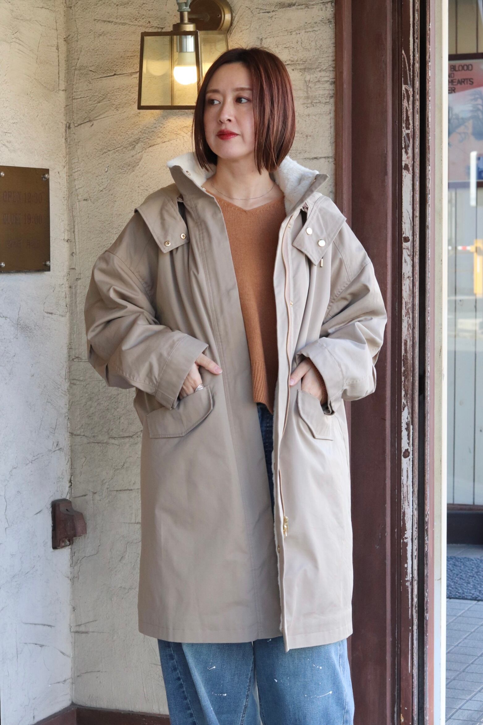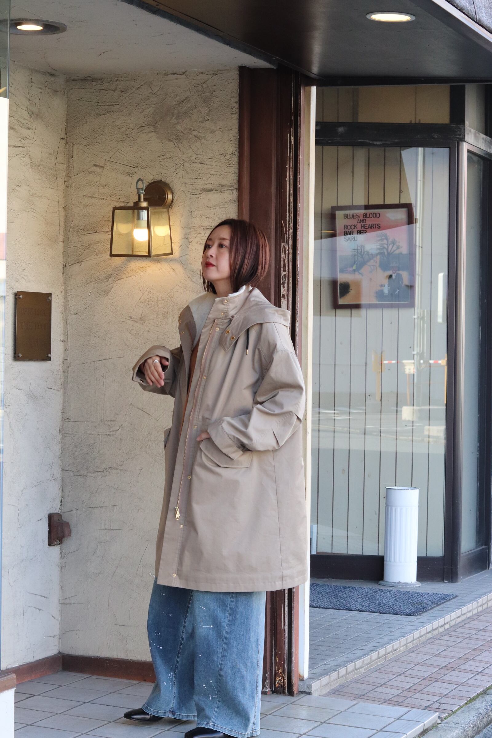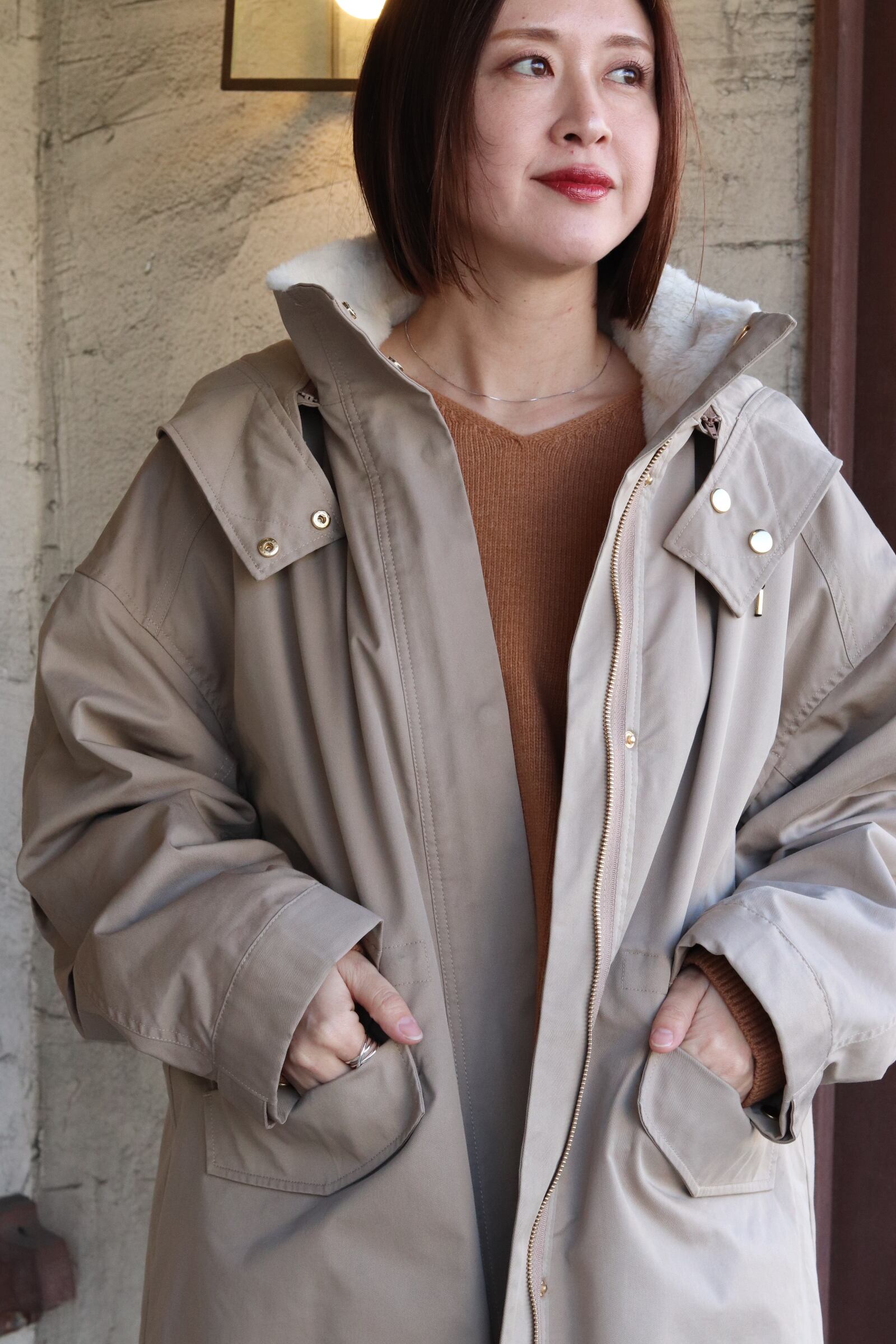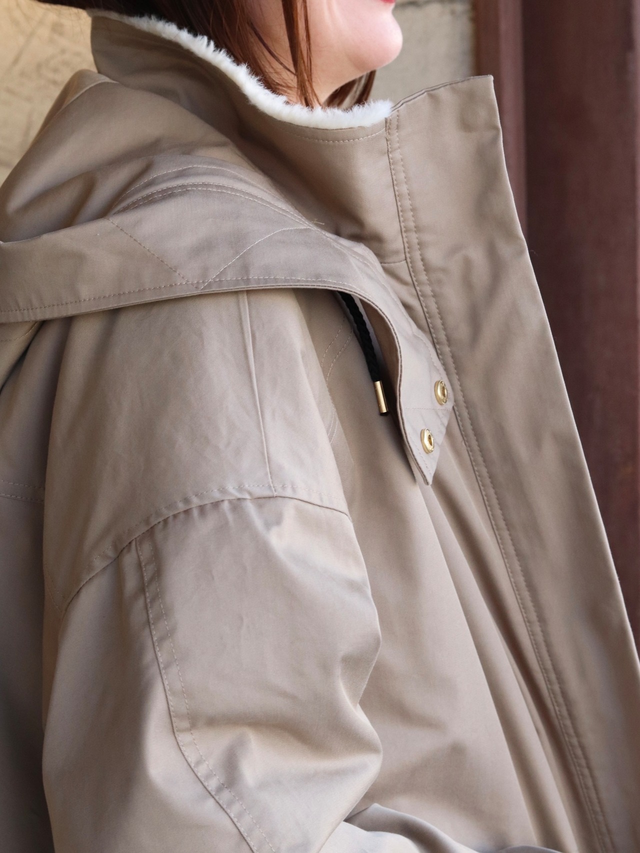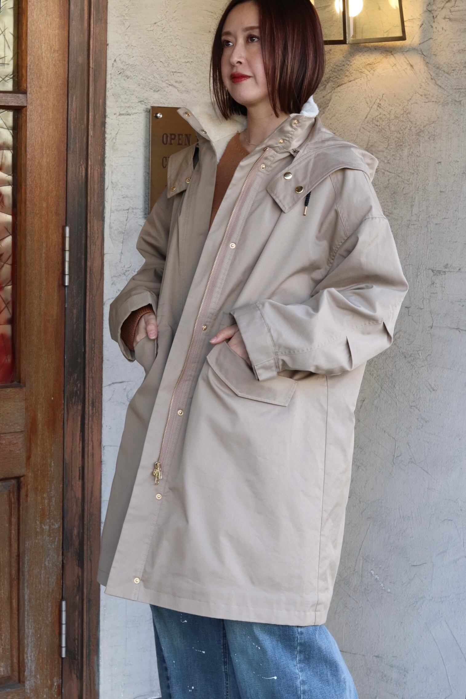 フード取り外し可能で、ウエストはドロスト調整ができるのでシルエットの印象を変えられます。背ヨークやベント風の切替で、動きやすさとデザイン性を両立。ツイルの落ち着いた表情とエコファーの暖かみがバランス良く融合した、機能性と見た目の両方を満たすハーフコートです。