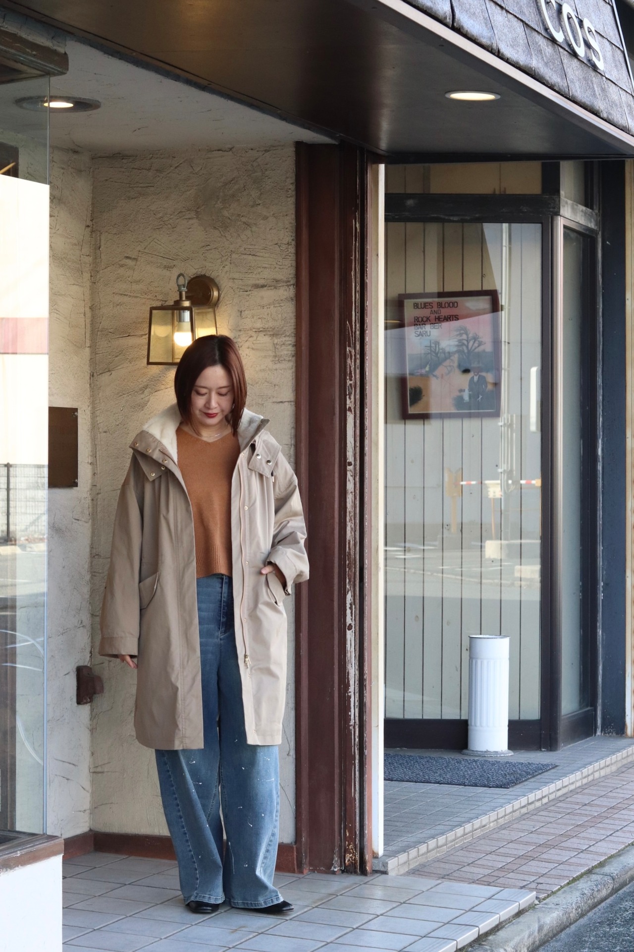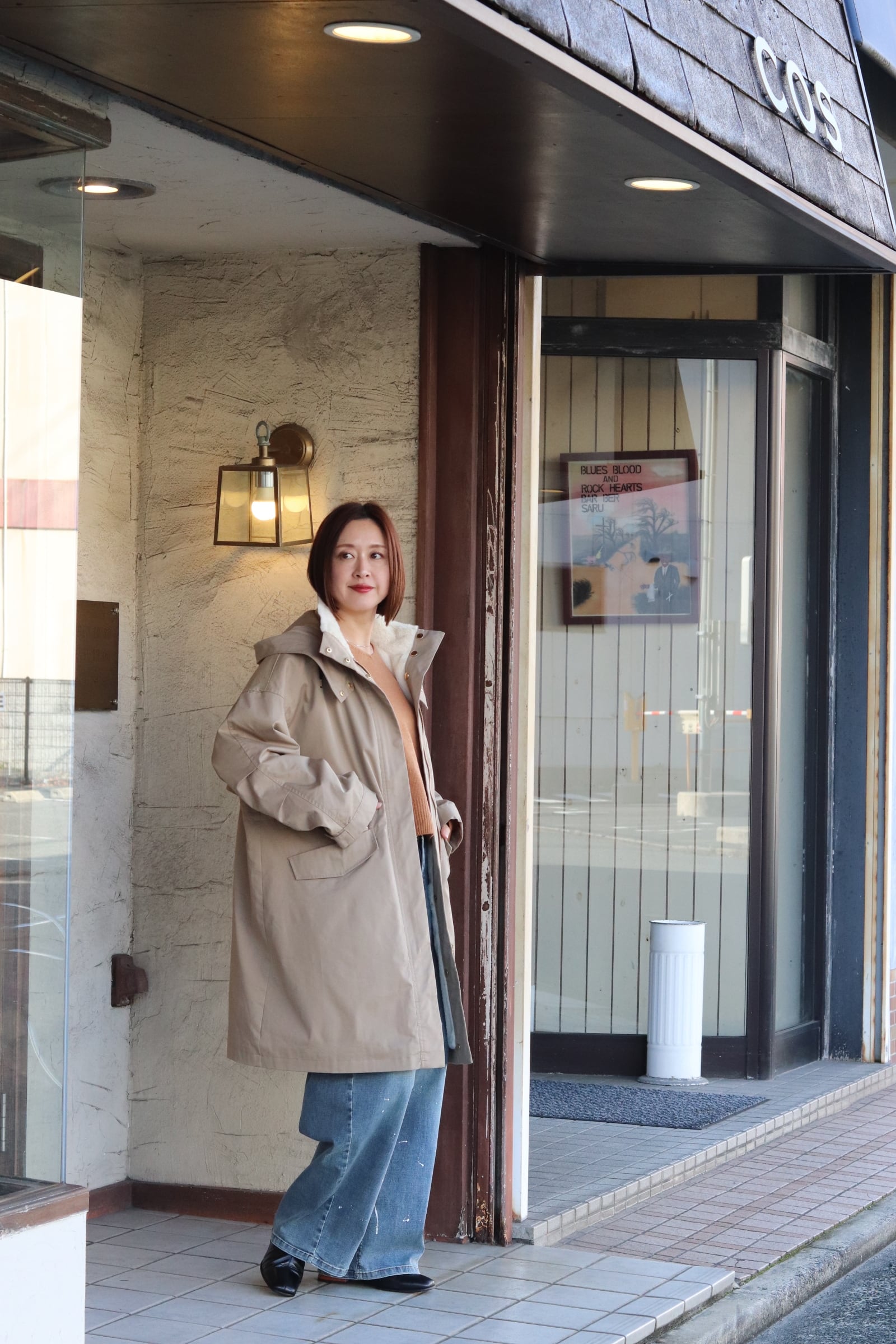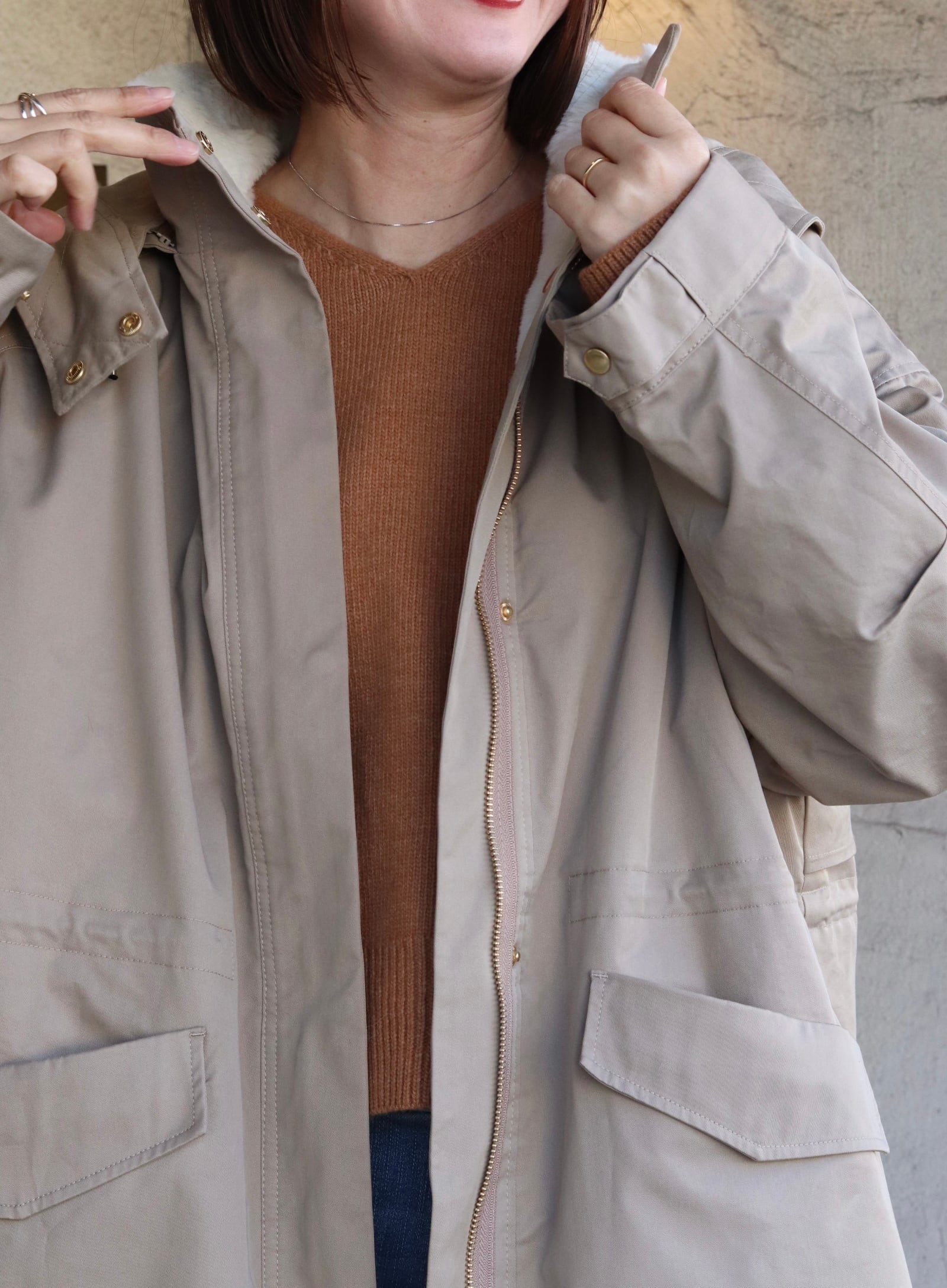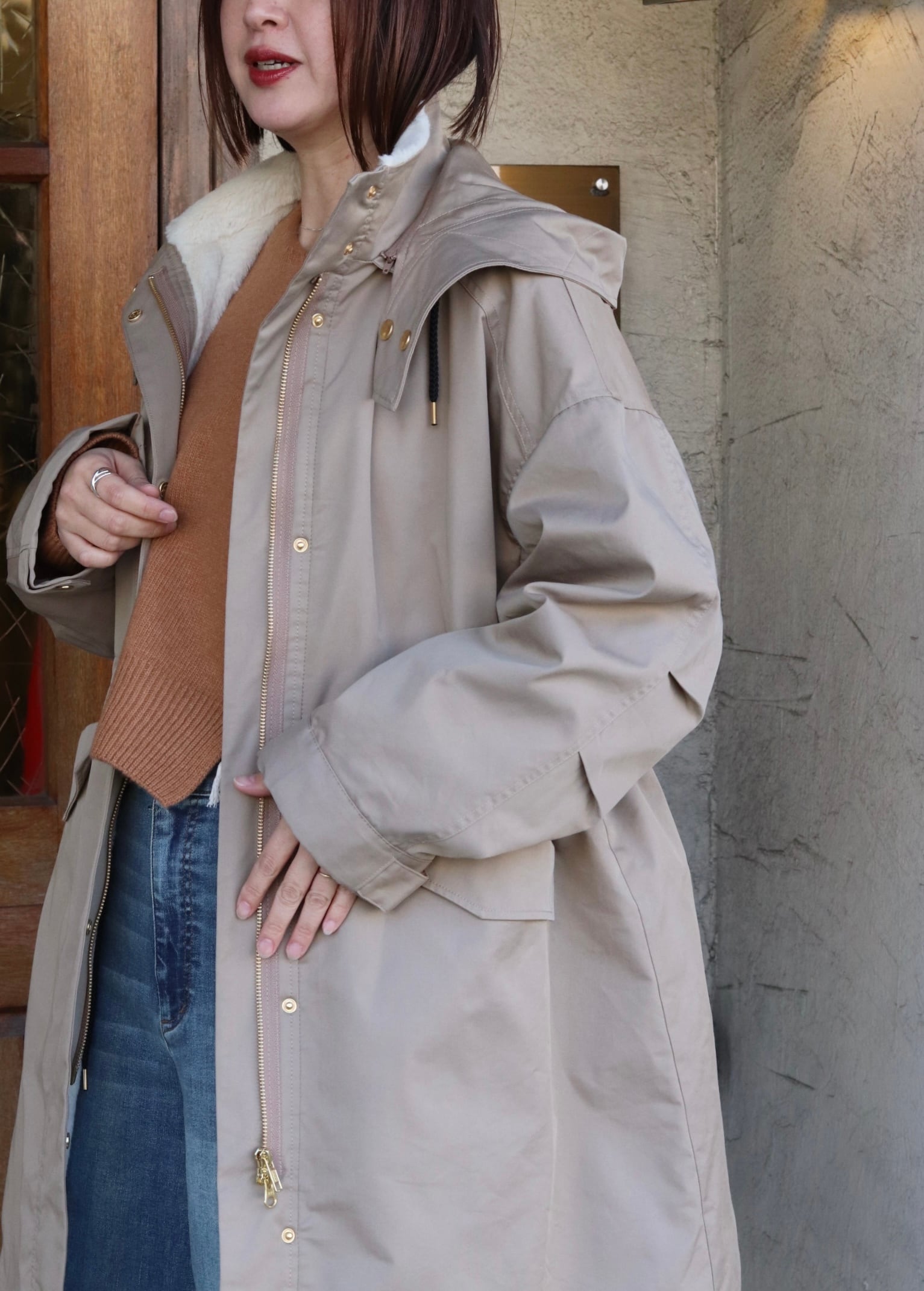 フード取り外し可能で、ウエストはドロスト調整ができるのでシルエットの印象を変えられます。背ヨークやベント風の切替で、動きやすさとデザイン性を両立。ツイルの落ち着いた表情とエコファーの暖かみがバランス良く融合した、機能性と見た目の両方を満たすハーフコートです。