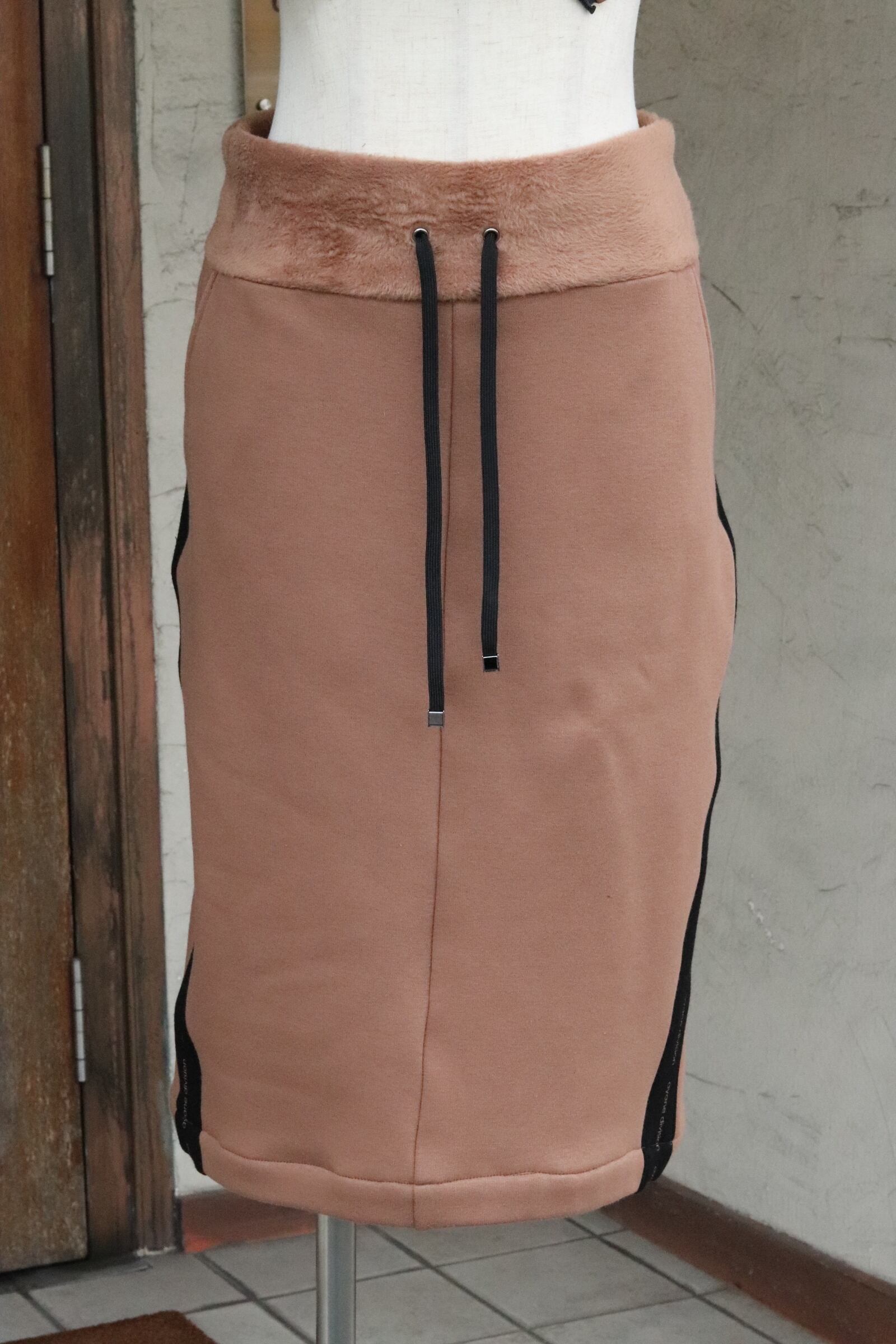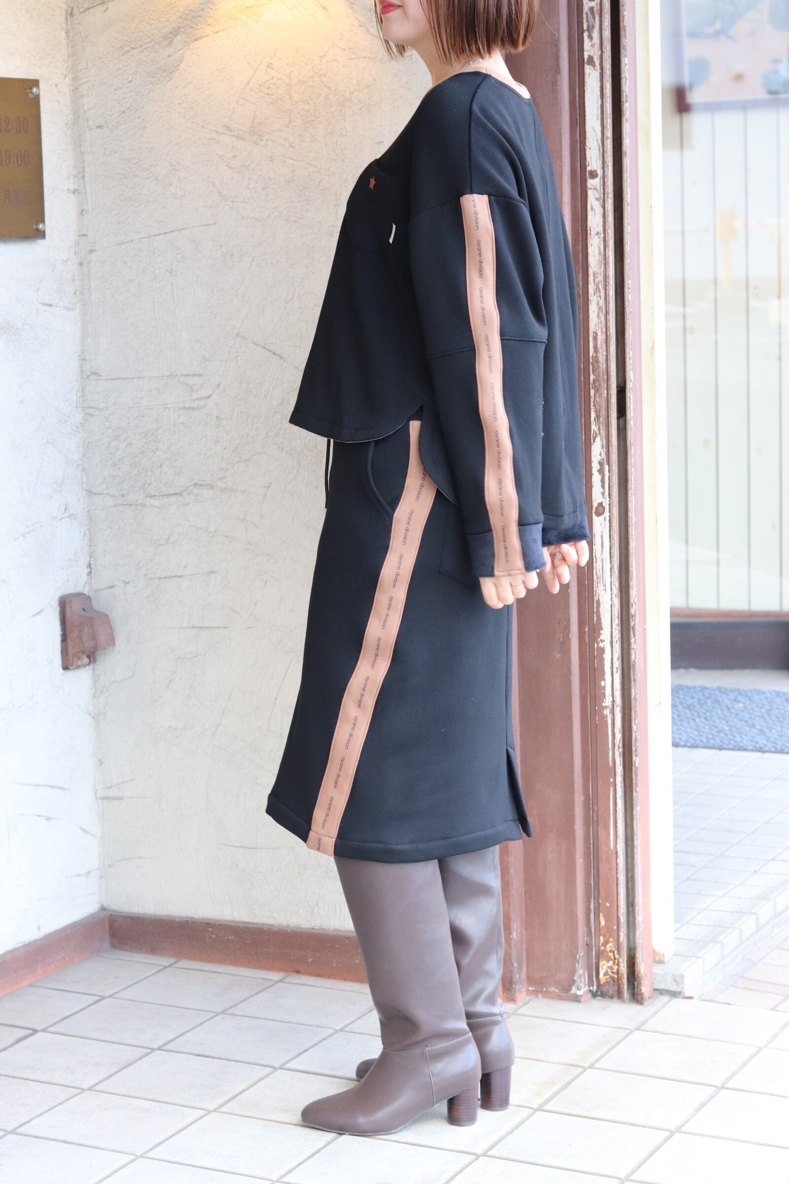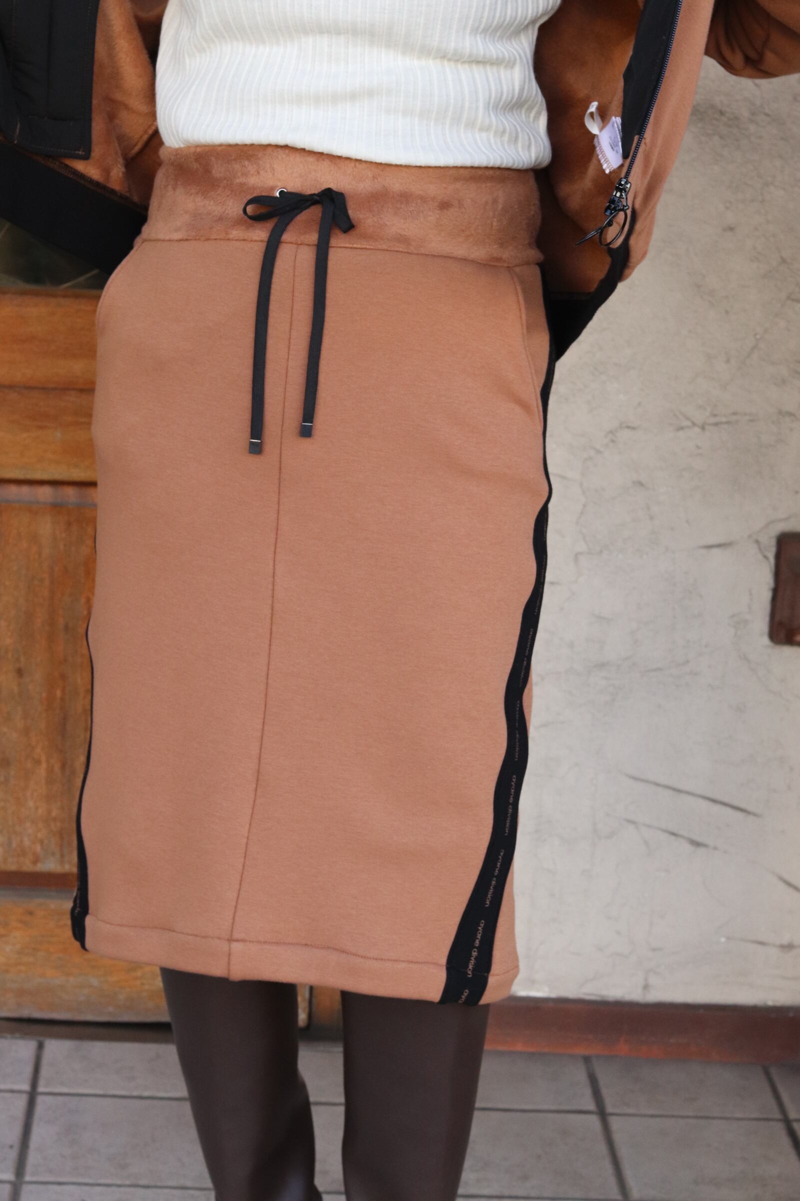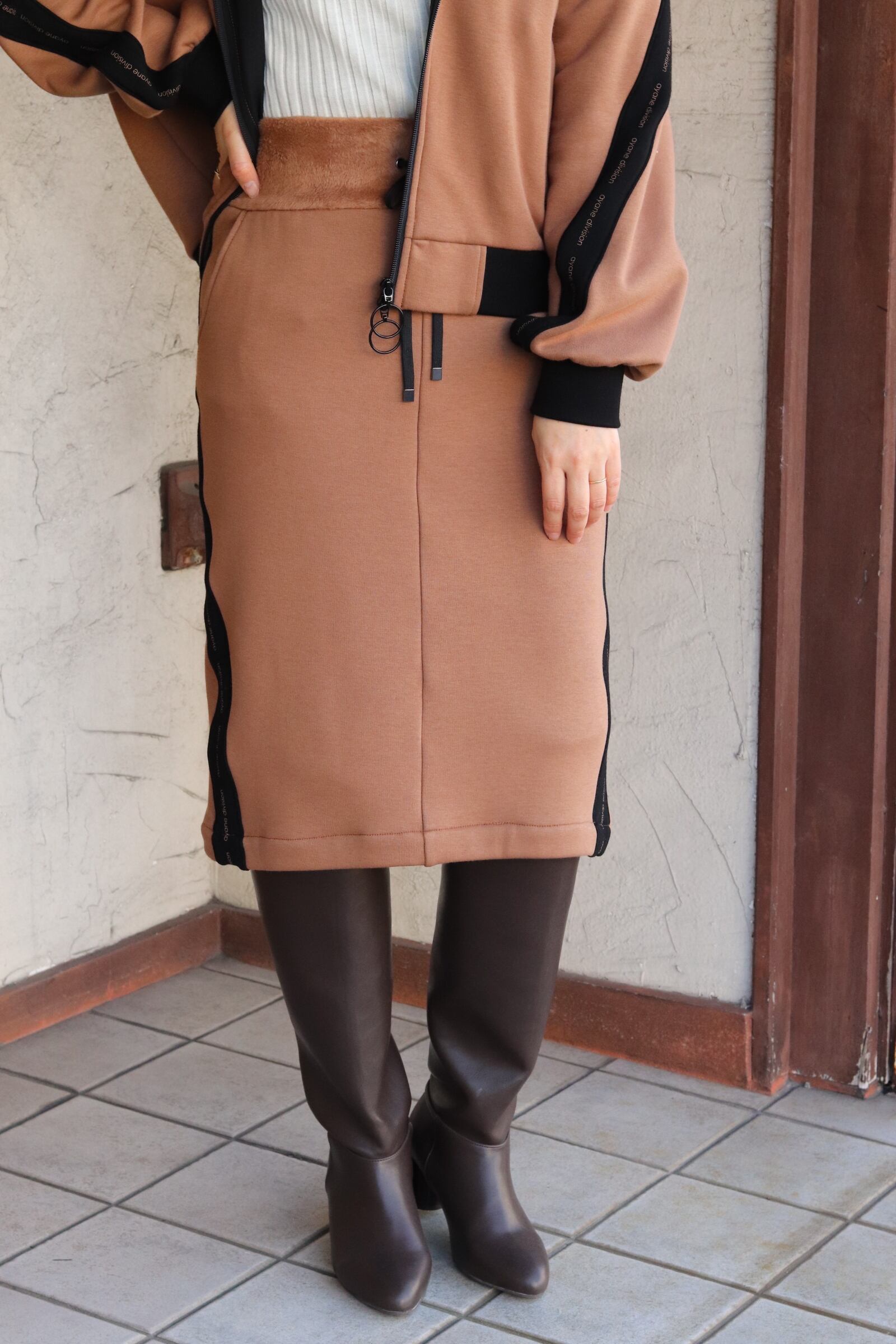 ミディアム丈のタイトスカートは、冬に活躍するロングブーツとの組み合わせがおすすめです。