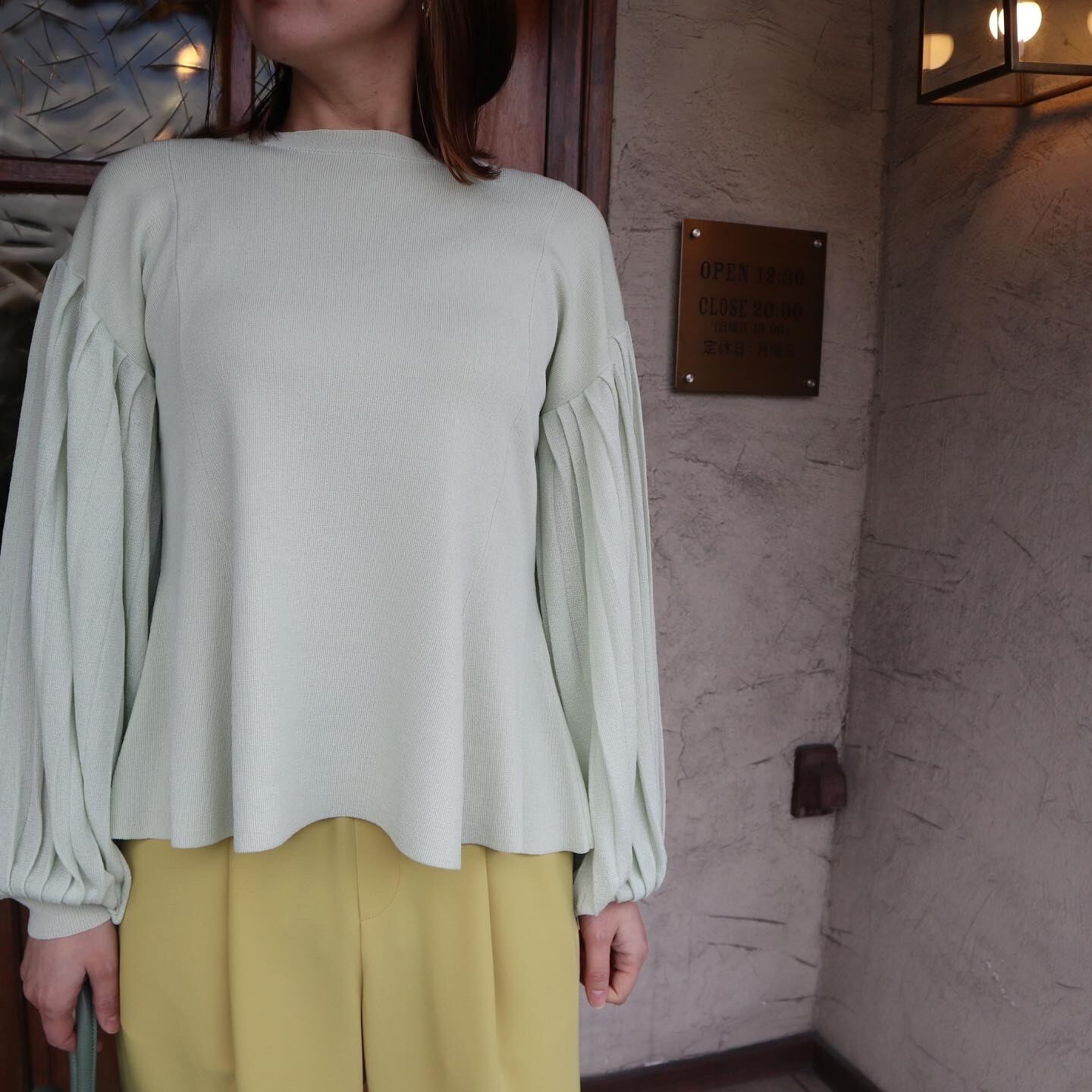 袖にプリーツがかかったペプラムニットです。身頃は切り替えを入れ程よいフィット感からのぺプラムが女性らしく、袖は少しシアー感のある程よい編み地にプリーツを入れているので表面に変化があり一枚です。