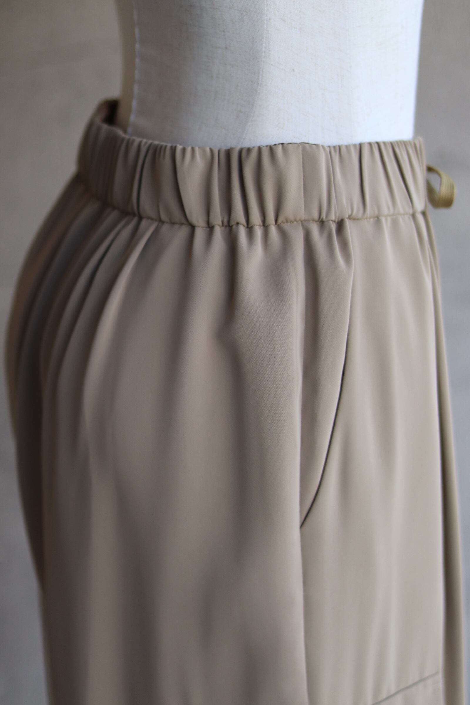 夏の展示会で大人気だった、とろみ系カーゴパンツです。生地の落ち感が最高で、寸法的にはたっぷりと分量をとっているのですが、縦に落ちる特性上、細く見えるという現象が高評価につながりました。