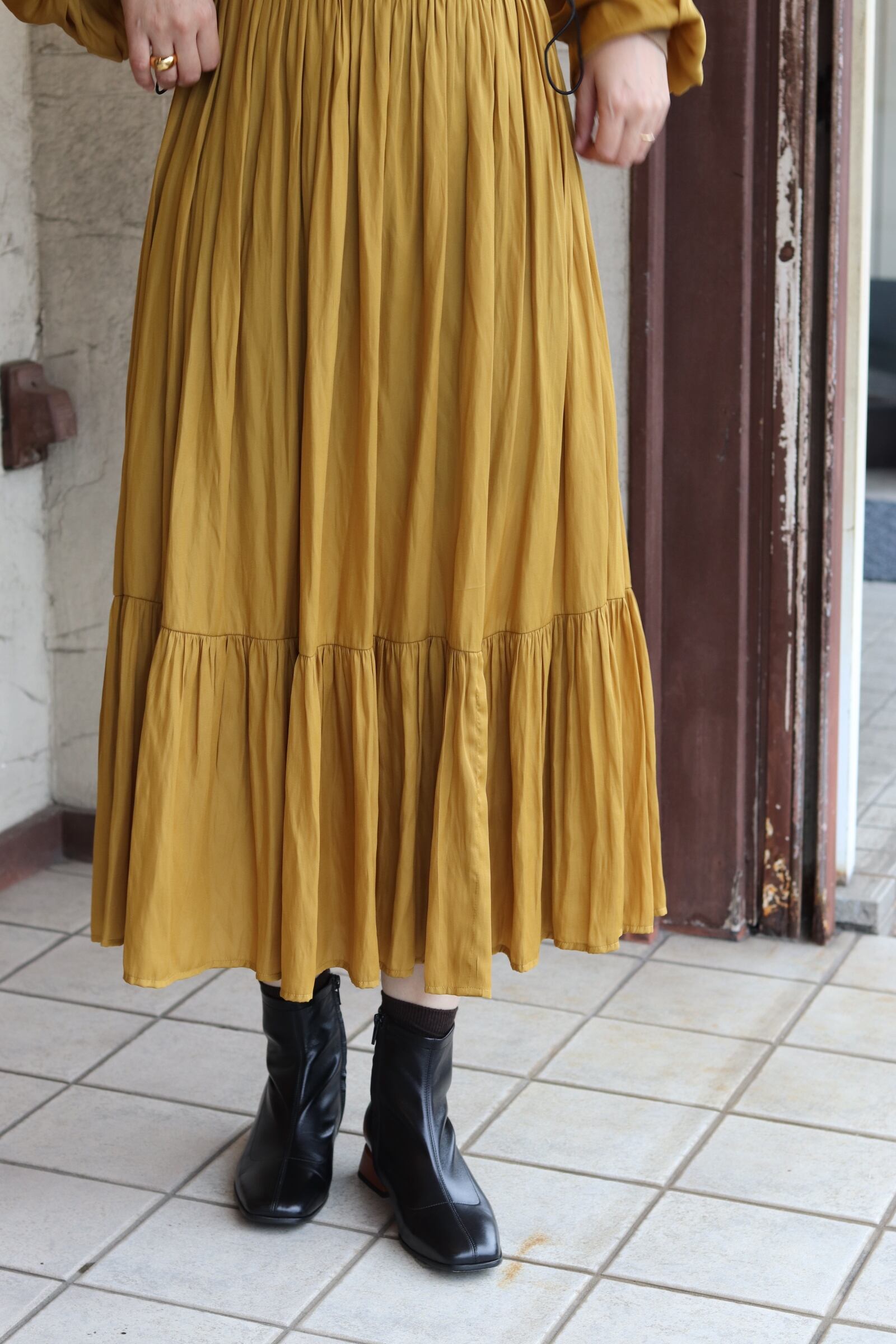 ギャザーがたっぷり入ったティアードデザインに、落ち感がある素材で体のラインを拾わず1枚で様になるアイテム。キレイめコンパクトなシルエットなので、カーディガンやジャケットなどの羽織とも相性抜群◎