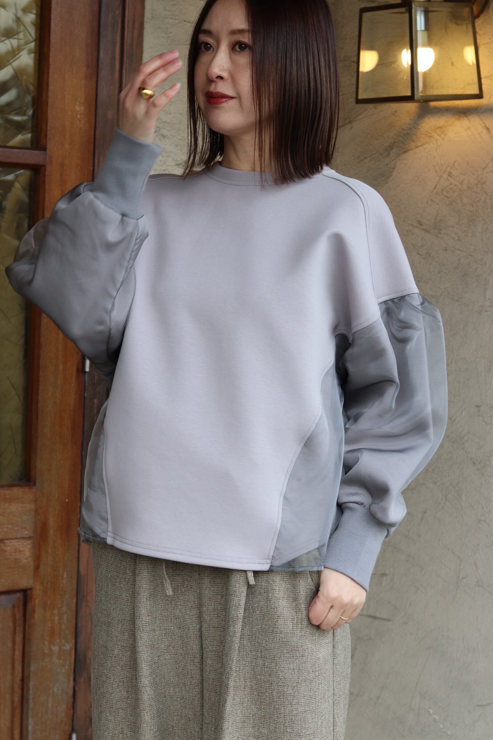 光沢のある生地感でカジュアルになりすぎずに着こなせます。袖とサイドのオーガンジー部分がふんわりと立体感を出し、トレンド感が+されコーデのアクセントに。