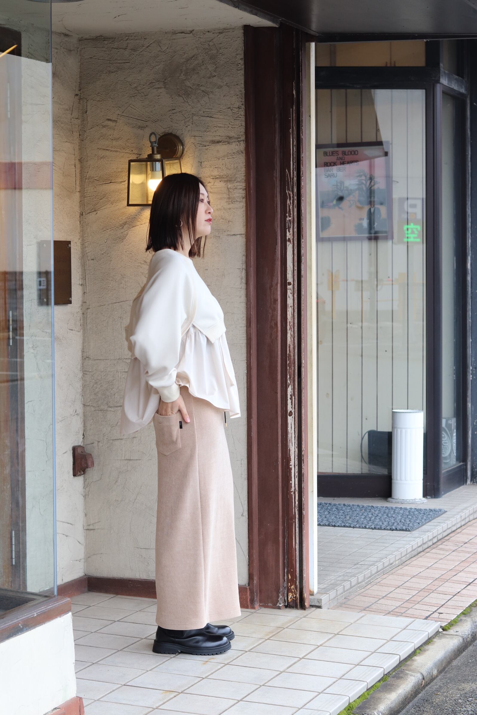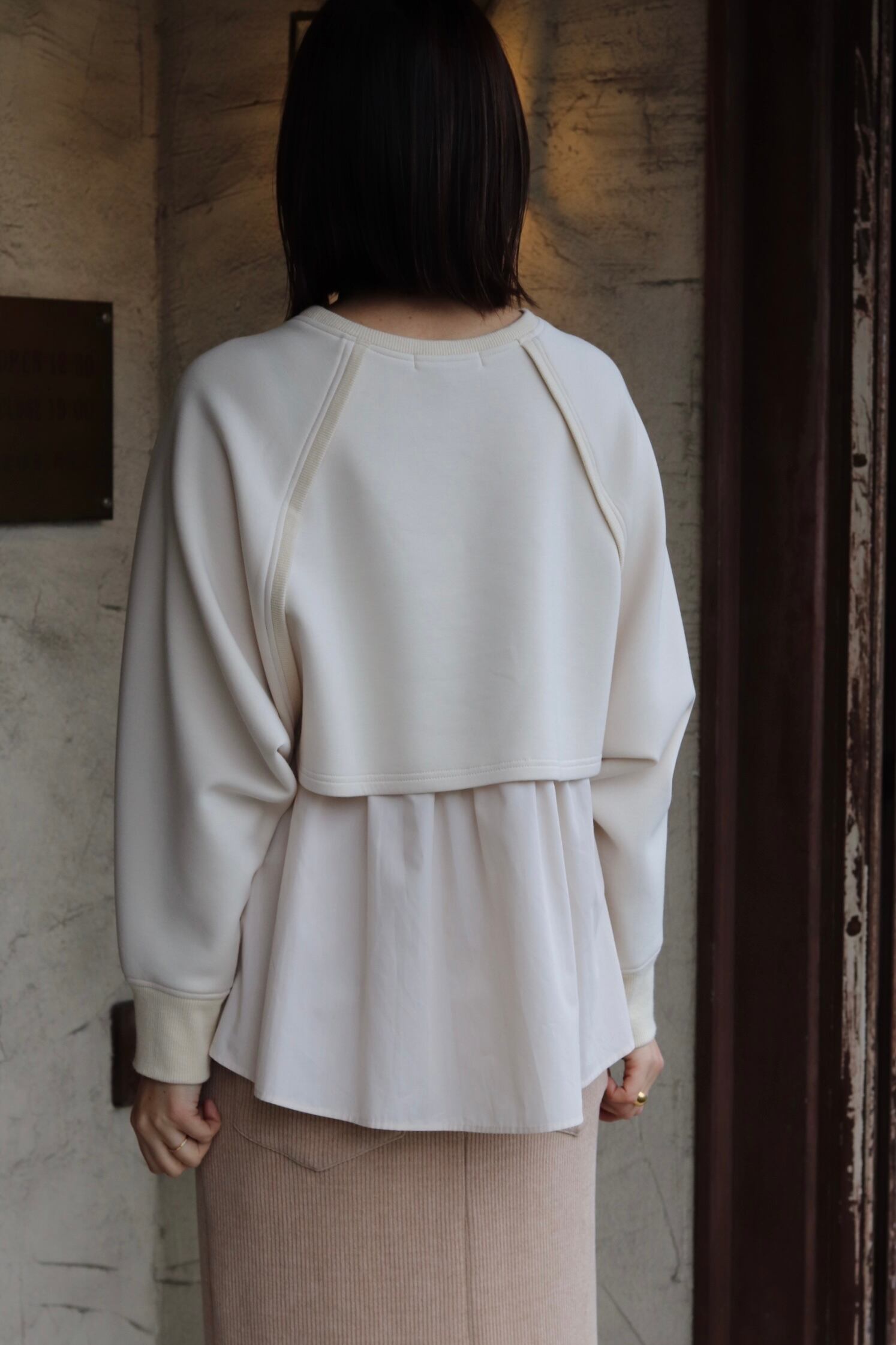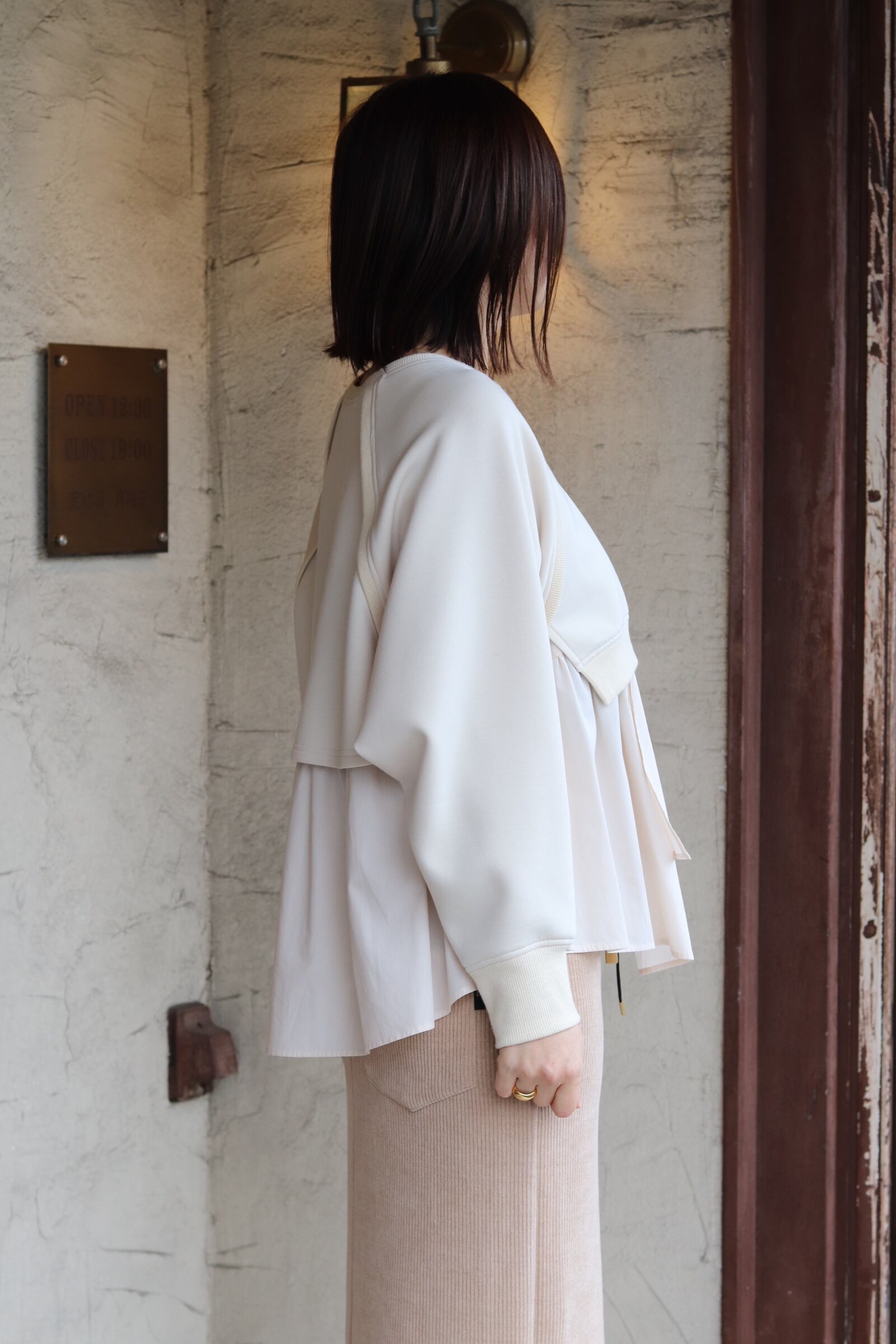 ふくらみとハリがあるソフトな風合いのダンボール生地にしなやかなブロード生地の裾ギャザーをドッキングしたプルオーバー。ふわっと華やかなアシンメトリーの裾ギャザーが、コーデを上品に仕上げてくれます。