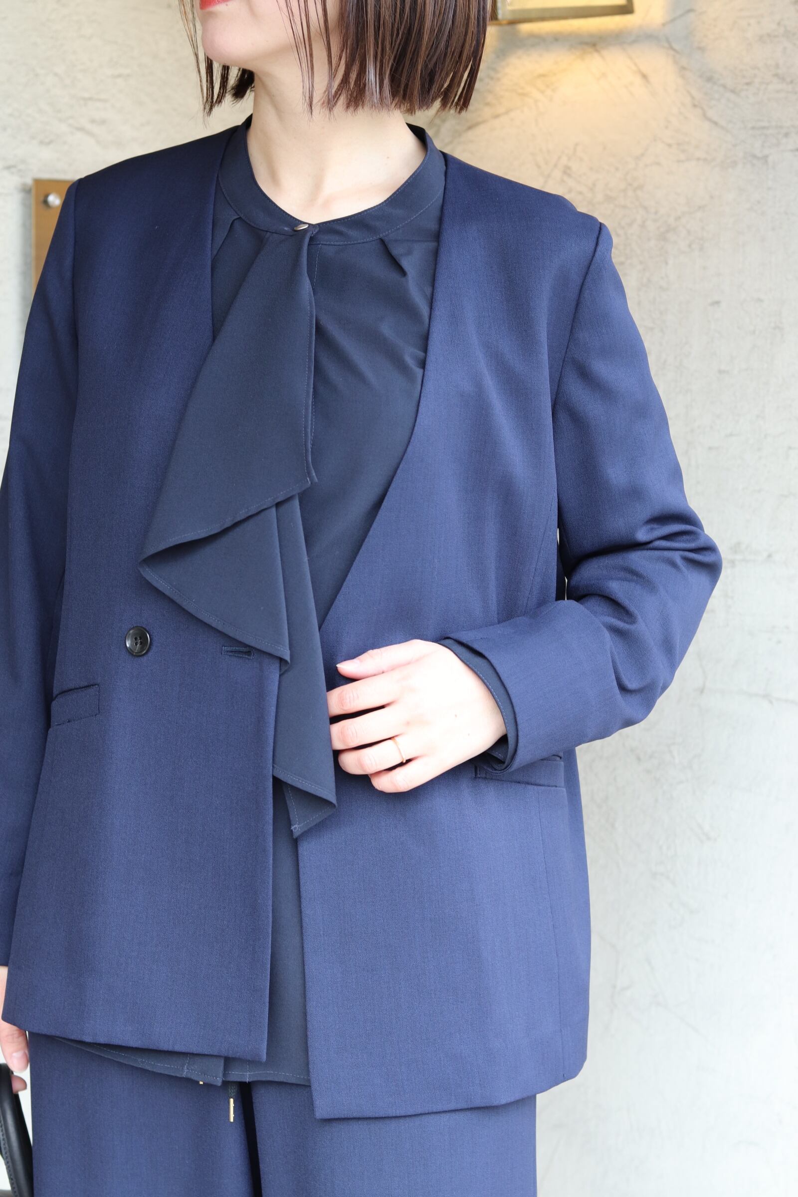 ボトムを選ばない着丈設定で、軽量でさくっと羽織ることができます。同素材パンツとのセットアップもおすすめです。オケージョンやオフィスにはもちろん、春のおでかけにも活躍する一枚です。